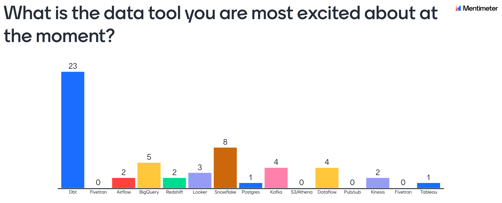 Finally, we asked the audience and our speakers to name the data tool they were the most excited about at the moment. By a large margin, dbt came in first. Not surprising given one of the most common job titles at the meetup was “analytics engineer” , a title literally invented by Fishtown Analytics, the creators of dbt. Yet, the tool that created the most discussion was BigQuery, with Rebecka as their champion. In her opinion, BigQuery is the most impressive tool out there with potential to claim even more space in the data stack. For instance, the scheduling of jobs in BigQuery could already replace a large chunk of the work done by data processing pipelines, removing the need for separate data processing tools like spark, beam or glue. Combining data storage and data processing has the potential to reduce the complexity of the data stack tremendously. These findings align with our observations regarding the most popular data tools in the Nordics with BigQuery and dbt being community favorites and being used by nearly half of the teams we’ve spoken to.