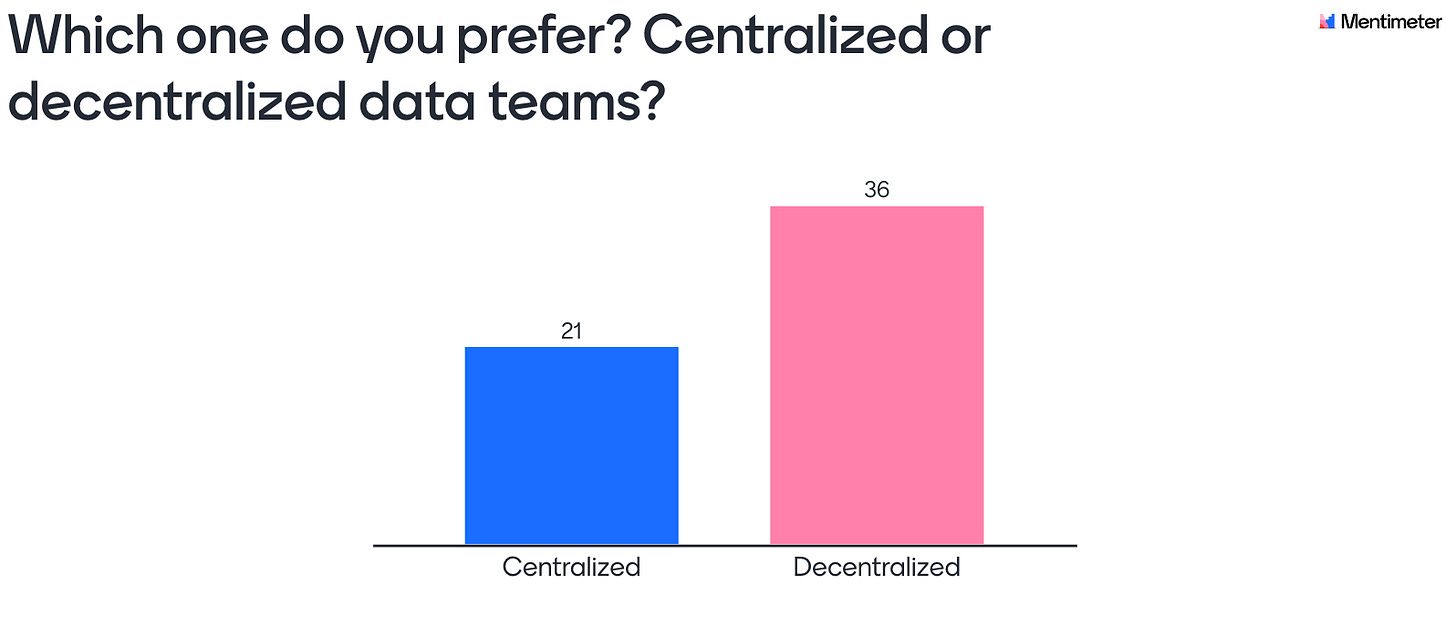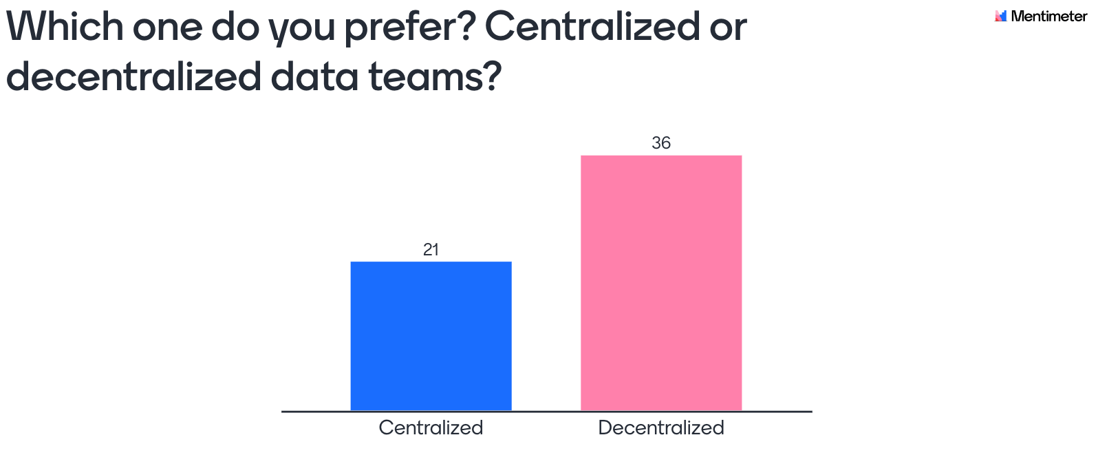 Next, the audience was asked to choose which one they preferred between two options: centralized or decentralized (also known as embedded or distributed) data-teams? To clarify, a centralized structure is one where all data resources—both people and technology—are owned and managed by one central data team. This team then receives requests from other divisions of the company and prioritizes tasks on a company-level in the fashion of a consulting-client relationship. Decentralized teams on the other hand are embedded into each part of the organization, assigned to a specific vertical and report not to another data professional but directly to the head of that department, say Sales or HR.