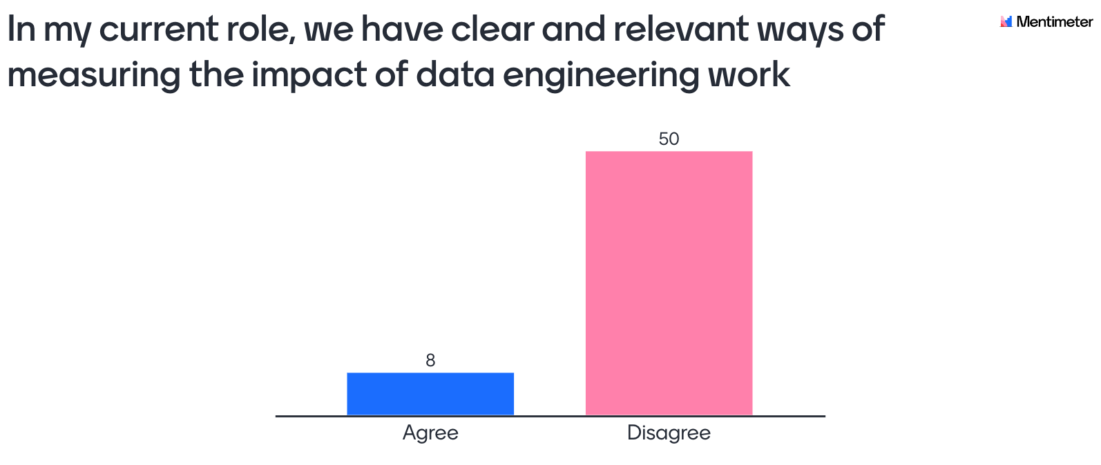 Right off the bat, the panelists and audience were asked whether they thought they had clear and relevant ways of measuring the impact of data engineering work in their current role. Overwhelmingly, the response was no. While most agree that a robust and scalable data infrastructure is a must-have for any data-driven company in 2022, its impact on the bottom line is often unclear and hard to evaluate.