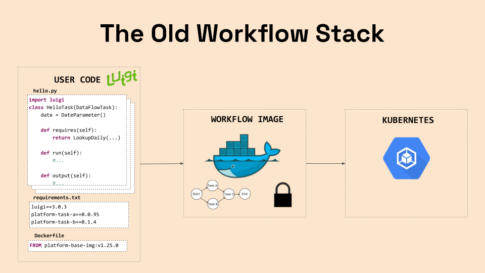In the old stack, users write their workflow code in the Luigi framework and use platform tasks provided by Spotify and open source Luigi through libraries. They would then build their workflow image based on a base image, also provided by Spotify, with additional dependencies. The complete workflow, including all tasks and dependencies, would get packaged into the image, and finally scheduled for deployment on Kubernetes.